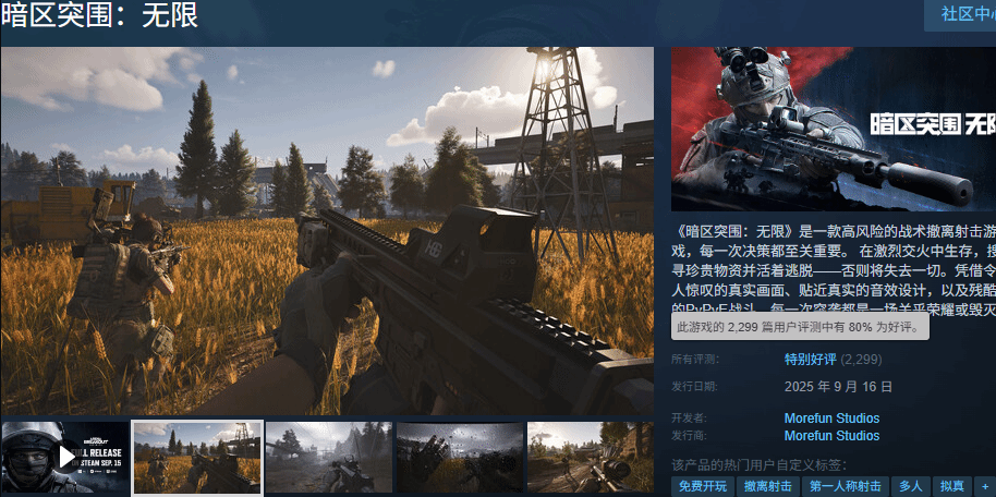 腾讯魔方工作室开发的暗区搜打撤类型大作《暗区突围 :无限》已于9月16日正式登陆Steam平台。截至目前 ,突围特别台对该作在Steam上已收获2299条玩家评价,无限好评率稳定在80% ,线获直装并获得“特别好评”标签,好评显示出玩家对其内容品质和玩法体验的支持战高度认可。